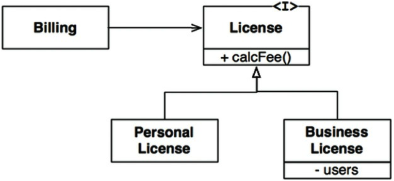 - 이 설계는 LSP를 준수하는데, Billing 애플리케이션의 행위가 License 하위 타입 중 무엇을 사용하는지에 전혀 의존하지 않기 때문이다. 이들 하위 타입은 모두 License 타입을 치환할 수 있다.