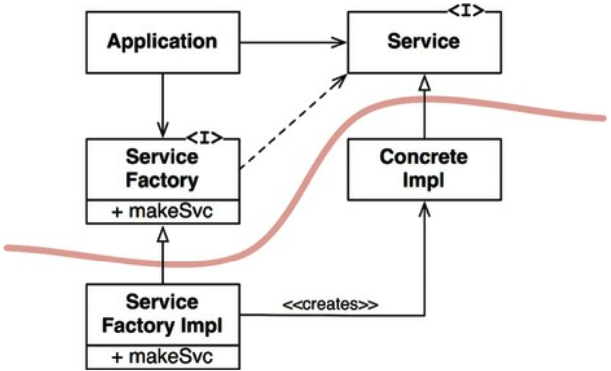 - 하지만 결국 Application 영역에서 Service Factory Impl을 주입 받아야 한다. Concrete Impl을 주입 받는 것과 어떻게 다를까? 변동성이 큰 구체 클래스가 아니기 때문이다.