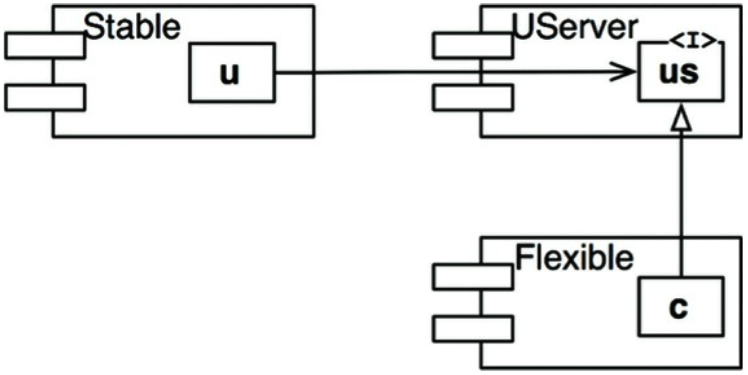 [그림 9-4. DIP 적용]- Stable의 Flexible에 대한 의존성을 끊을 수 있고, 두 컴포넌트는 모두 UServer에 의존하도록 강제한다. UServer는 매우 안정된 상태(I = 0)이며, Flexible은 자신에게 맞는 불안정성을 그대로 유지할 수 있다. 이제 모든 의존성은 I가 감소하는 방향으로 향한다.