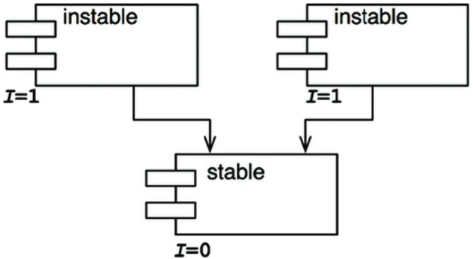 - I 값이 1이면, 어떤 컴포넌트도 이 컴포넌트에 의존하지 않지만(Fan-in_=0), 해당 컴포넌트는 다른 컴포넌트에 의존한다(_Fan-out > 0)는 뜻이다. 이 상태는 컴포넌트가 가질 수 있는 최고로 불안정한 상태다.
