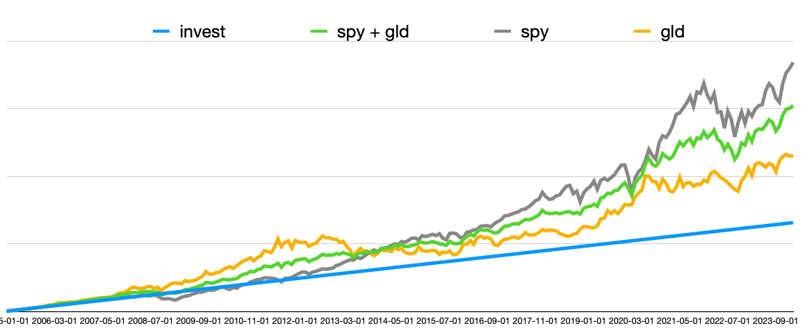 | SPY + GLD 1:1 rebalancing | 131% | -31 / 7 / 26 % |