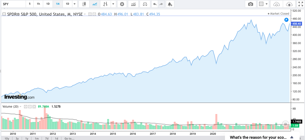 최근 10년간 미국 S&P 500을 추종하는 SPY는 가파르게 올랐다.
